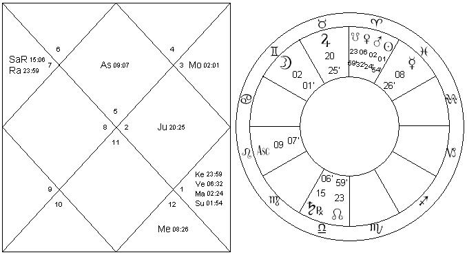 The only angular planet is Jupiter. As lord of the fifth it represents theater and sports events, as eighth lord it invites tragedy and trauma.