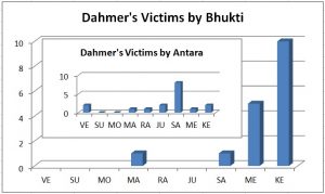 Finally, note within the inset graph that, over the entire span of Dahmerâs killings, most of them were committed in the antara (sub-period) of Saturn, some of which were in his Mercury bhukti, but the majority in a flurry of violence during his Ketu bhukti in the spring and summer of 1991.