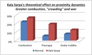 However, in an analysis of 600 charts, the observed occurrence of planetary war is 13.6%. In other words, Kala Sarpa almost doubles the actual incidence of graha yuddha compared to the average chart.