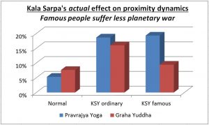 Note the difference, however, between ordinary and famous people with Kala Sarpa charts. Although both groups have the same observed incidence of Pravrajya yogas (18.8%), the presence of graha yuddha is radically different. Whereas planetary war occurs 16.0% of the time in Kala Sarpa charts of ordinary people, it appears only 9.5% of the time in charts of famous people.
